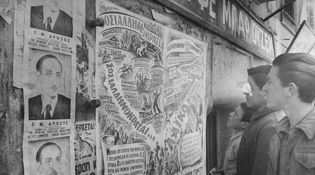 Νεαροί πολίτες στέκονται μπροστά από μια αφίσα του Λαϊκού Κόμματος με συμβολικές αναφορές. Δίπλα φωτογραφίες ενός υποψηφίου, του γνωστού δημοσιογράφου Γεωργίου Δρόσου, που τότε πολιτευόταν με τη Δεξιά.