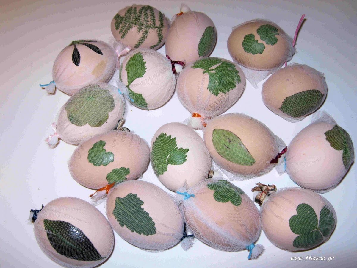 - Φυσικά και μπορούμε να κάνουμε και σχέδια στα αυγά μας με διάφορα φυλλαράκια αρκεί να είναι πλατιά, τυλίγοντάς τα με τούλι ή καλτσόν.