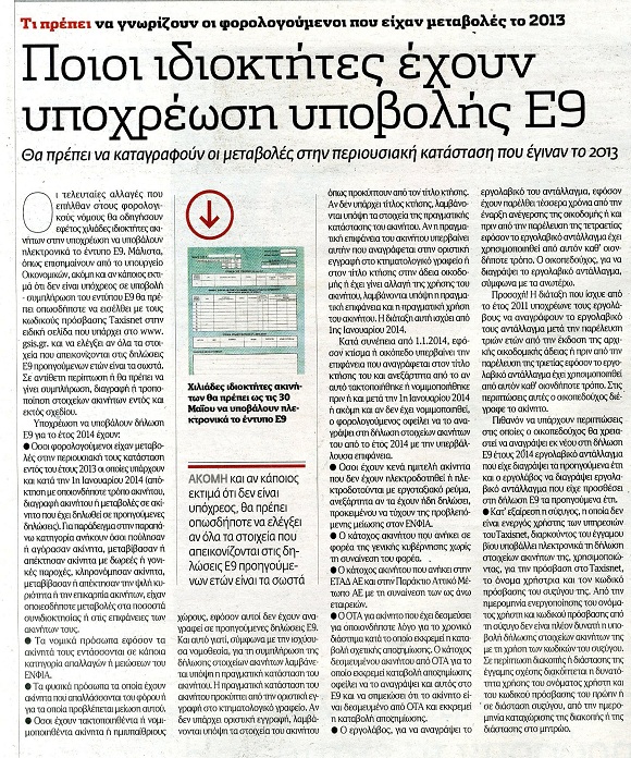 Οι τελευταίες αλλαγές που επήλθαν στους φορολογικούς νόμους θα οδηγήσουν φέτος χιλιάδες ιδιοκτήτες ακινήτων στην υποχρέωση να υποβάλουν ηλεκτρονικά το έντυπο Ε9.