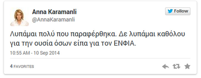 Σε έξαλλη κατάσταση η 'Αννα Καραμανλή στη Βουλή για τον ΕΝΦΙΑ. Η βουλευτής της Νέας Δημοκρατίας σε έντονο ύφος είπε χθες στον σύμβουλο του κ.Χαρδούβελη:«Ξέρετε κύριέ μου, ότι οι πολίτες υποφέρουν; Και ότι αυτά που μας λέτε εδώ δεν θα κάνουν τη ζωή τους καλύτερη;». Το μόνο, λένε, που πρόλαβε να πει ο σύμβουλος ήταν: «Γιατί φωνάζετε;» Τότε, ποιος είδε την Άννα Καραμανλή και δεν την φοβήθηκε... Η γαλάζια βουλευτής με δάκρυα στα μάτια άρχισε να φωνάζει: «Να πάτε στον Χαρδούβελη και να του τα πείτε αυτά». Η κυρία Καραμανλή εξερράγη και χρησιμοποίησε σκαιούς χαρακτηρισμούς λέγοντας: «Να πάει να γ... ο Χαρδούβελης». Και συνέχισε, εκφράζοντας το παράπονο και την απόγνωσή της για την ακολουθούμενη πολιτική:«Με αυτά που κάνετε δεν θα επανεκλεγούν πολλοί βουλευτές και εγώ θα μείνω άνεργη!».... Το επεισόδιο έλαβε τέλος με ανάρτηση της βουλευτού της ΝΔ στο twitter: