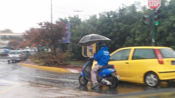 Παραλιακή Λεωφόρος Ηρακλείου. Η βροχή πέφτει δυνατή κι ο δικυκλιστής, εκτός από τον σωστό εξοπλισμό, δηλαδή το κράνος και το αδιάβροχο... επιλέγει να κρατήσει με το ένα χέρι και μία ομπρέλα, προκειμένου να προστατευτεί από τη βροχή...