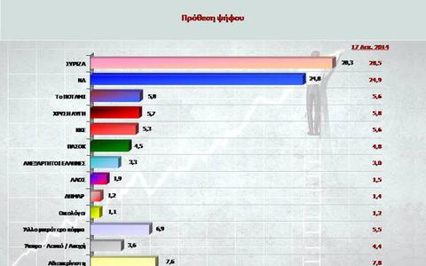Προβάδισμα του ΣΥΡΙΖΑ με 3,5% έναντι της ΝΔ στην πρόθεση ψήφου, σύμφωνα με δημοσκόπηση που πραγματοποίησε η εταιρία Marc για λογαριασμό του Alpha. Συγκεκριμένα, στο ερώτημα «αν γίνονταν σήμερα εκλογές τι θα ψηφίζατε», ΣΥΡΙΖΑ απάντησε το 28,5% των ερωτηθέντων και ΝΔ το 24,9%. Στην τρίτη θέση βρίσκεται το Ποτάμι 5,8%.