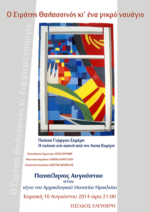 Το Αρχαιολογικό Μουσείο Ηρακλείου στο πλαίσιο των εκδηλώσεων για την αυγουστιάτικη πανσέληνο φιλοξενεί στον ανακαινισμένο κήπο του την παράσταση «Ο Στράτης Θαλασσινός κι ένα μικρό ναυάγιο» σε ποίηση Γιώργου Σεφέρη. Η ποίηση στη σκηνή από την Άσπα Κυρίμη.