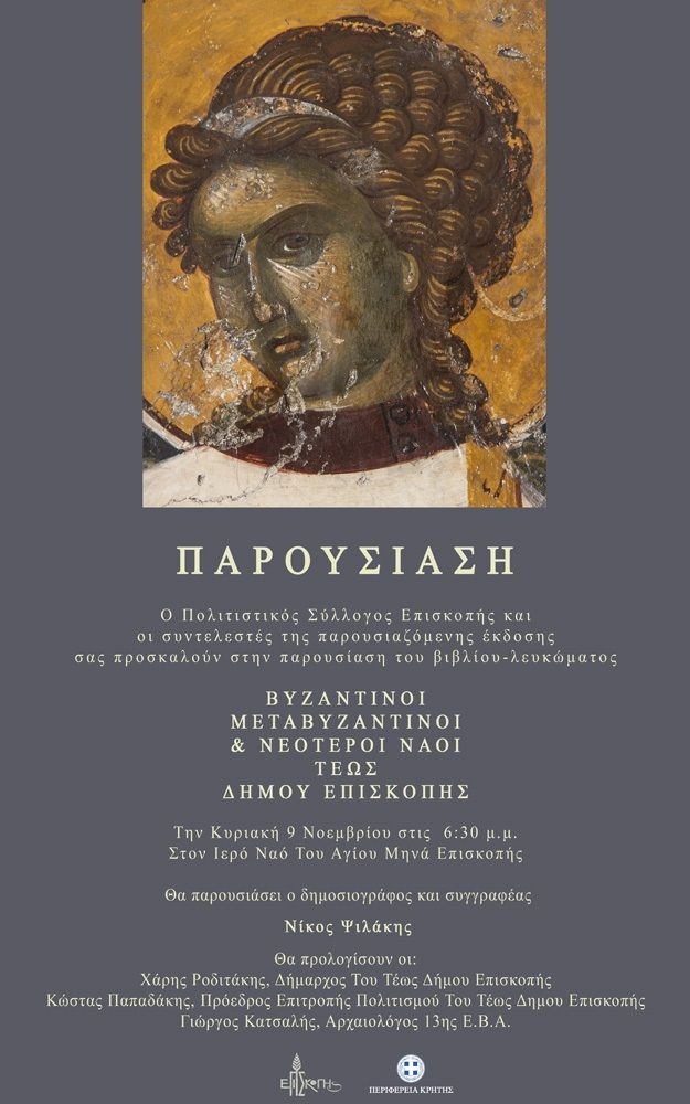 Ο Πολιτιστικός Σύλλογος Επισκοπής και οι συντελεστές της παρουσιαζόμενης έκδοσης οργανώνουν την παρουσίαση του βιβλίου – λευκώματος, ΒΥΖΑΝΤΙΝΟΙ ΜΕΤΑΒΥΖΑΝΤΙΝΟΙ & ΝΕΟΤΕΡΟΙ ΝΑΟΙ ΤΕΩΣ ΔΗΜΟΥ ΕΠΙΣΚΟΠΗΣ, την Κυριακή 9 Νοεμβρίου στις 6.30 μ.μ. στον Ιερό Ναό Αγίου Μηνά Επισκοπής. Το βιβλίο θα παρουσιάσει ο δημοσιογράφος και συγγραφέας Νίκος Ψιλάκης.