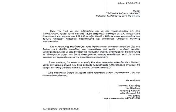 Γιατί; Η ηλικιωμένη γυναίκα όπως αναφέρει στην επιστολή του προς την Τροχαία ΒΟΑ Κρήτης, από το πουθενά και εντελώς ξαφνικά πετάχτηκε στη μέση του δρόμου και με χαλαρό ρυθμό άφησε μία τσάντα με πορτοκάλια(!) πάνω στη διπλή διαχωριστική γραμμή της εθνικής οδού.