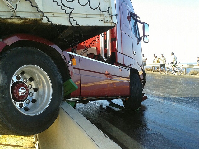 Όλα έγιναν όταν το λάστιχο της νταλίκας έσκασε με αποτέλεσμα ο οδηγός να χάσει τον έλεγχο του οχήματος και να προσκρούσει στη διαχωριστική νησίδα και στη συνέχεια να συγκρουστεί με το άσπρο ΙΧ που βλέπετε στις φωτογραφίες.