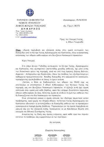 Στην από τις 15-4-2014 επιστολή του προς τον Υπουργό Υγείας κ. Άδωνι Γεωργιάδη ο Δήμαρχος Ζαχαρίας Καλογεράκης είχε αναφέρει: