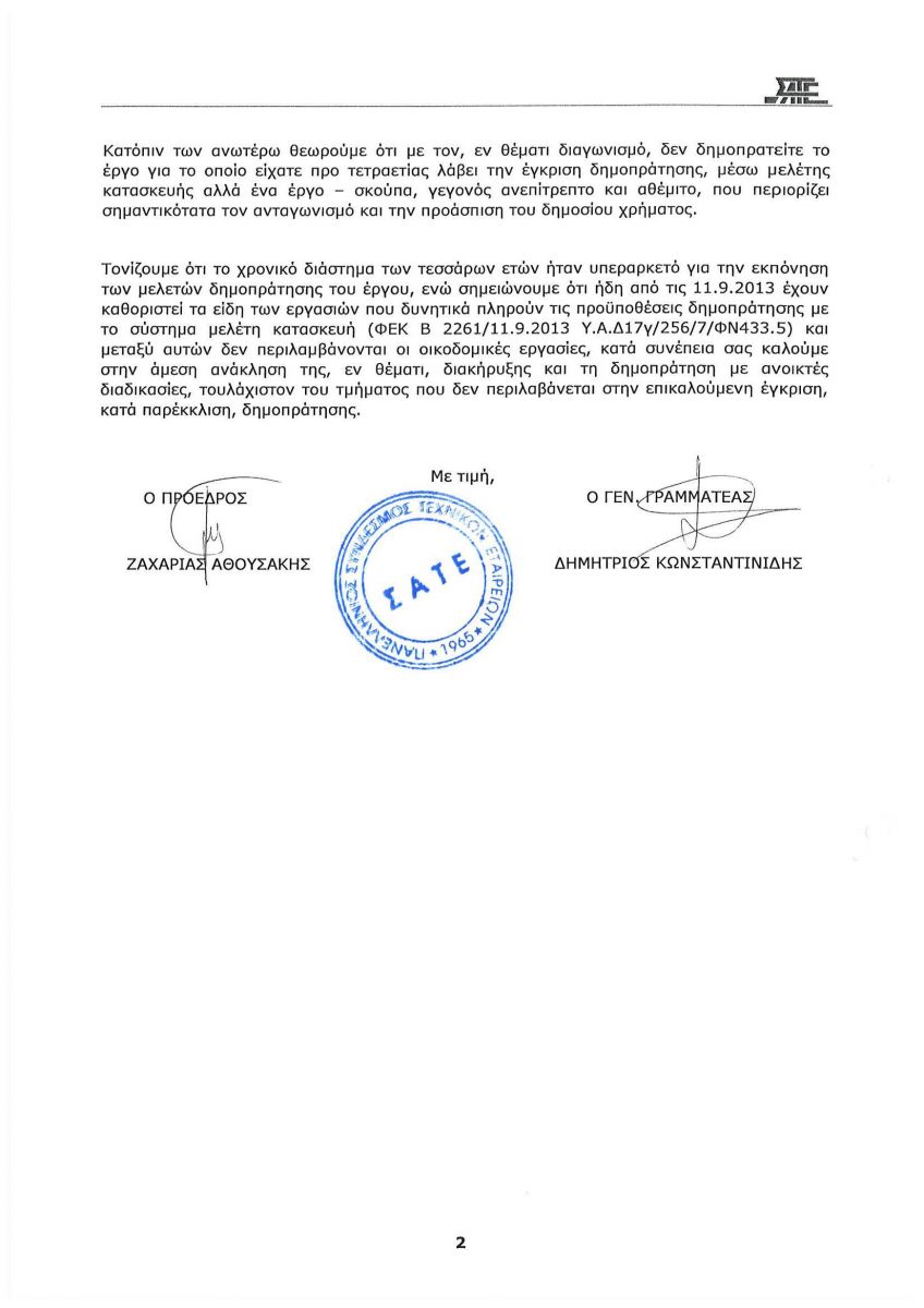 Ο Σύνδεσμος υπογραμμίζει ότι μέσα σε 4 χρόνια θα μπορούσαν να είχαν γίνει μελέτες δημοπράτησης του έργου, και ζητούν την ανάκληση της δημοπράτησης "με ανοιχτές διαδικασίες", καθώς τίθεται θέμα νομιμότητας.