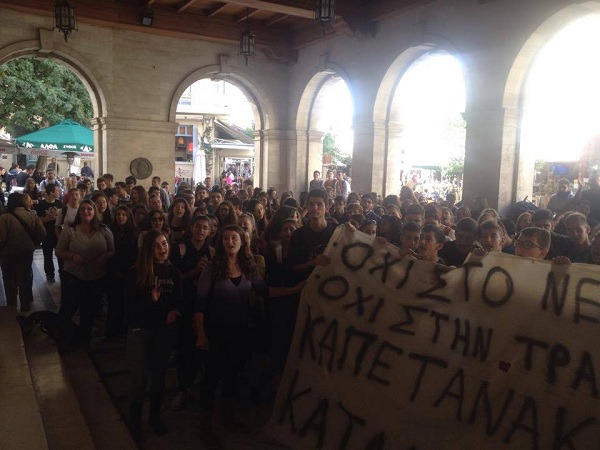 Διαμαρτυρία στο αίθριο της Λότζια πραγματοίησαν το πρωί, μαθητές από το πολύπαθο Καπετανάκειο και το 3ο Λύκειο Ηρακλείου με τα αιτήματα των καταλήψεων, δηλαδή "όχι στην Τράπεζα Θεμάτων και το νέο Λύκειο"