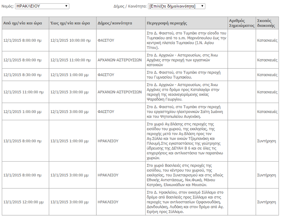 Προγραμματισμένες διακοπές ρεύματος θα σημειωθούν τη Δευτέρα 12 και την Τρίτη 13 Ιανουαρίου 2014 σε περιοχές του Νομού Ηρακλείου, σύμφωνα με το πρόγραμμα διακοπών ρεύματος του ΔΕΔΗΕ. Αναλυτικά: