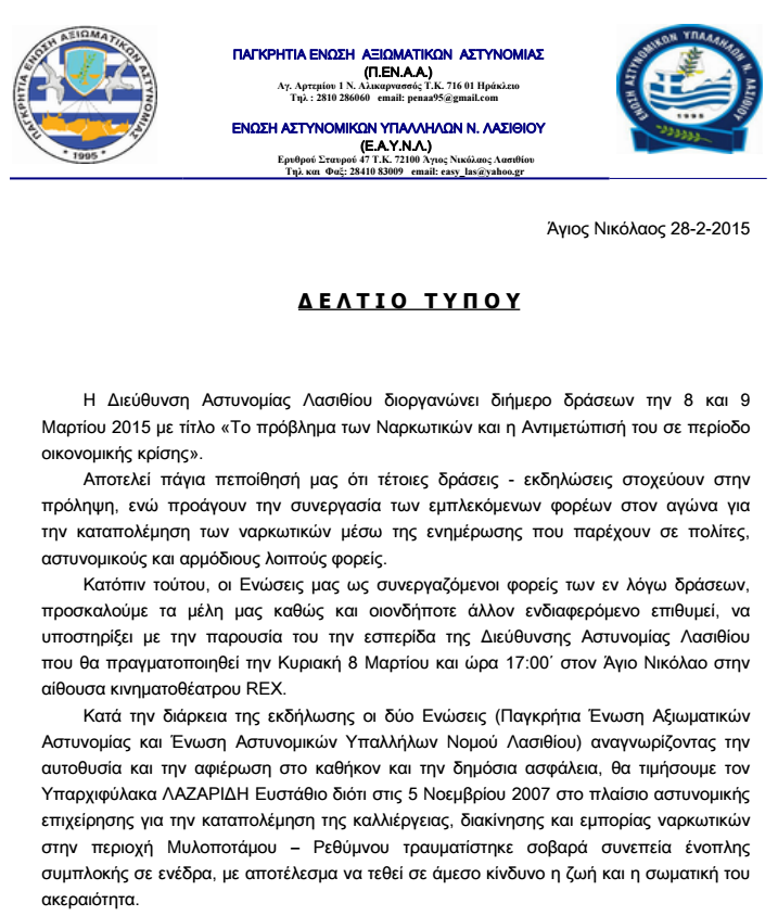Διήμερο δράσεων με τίτλο «Το πρόβλημα των Ναρκωτικών και η Αντιμετώπισή του σε περίοδο οικονομικής κρίσης" διοργανώνει η Διεύθυνση Αστυνομίας Λασιθίου την 8 και 9 Μαρτίου του 2015.