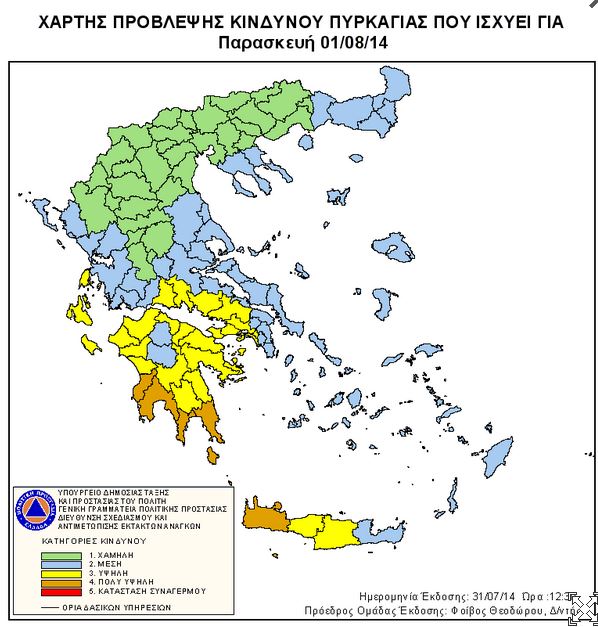 Πολύ υψηλός είναι για την Παρασκευή 1 Αυγούστου ο κίνδυνος για εκδήλωση πυρκαγιάς στο Νομό Χανίων καθώς σύμφωνα με τον χάρτη πρόβλεψης της ΓΓΠΠ, ο βαθμός επικινδυνότητας βρίσκεται στο 4. Για τους Νομού Ρεθύμνου και Ηρακλείου ο βαθμός είναι στο 3, βαθμός που χαρακτηρίζεται ως υψηλός κίνδυνος. Για το νομό Λασιθίου ο κίνδυνος για εκδήλωση πυρκαγιάς βρίσκεται στο 2 (μέσος κίνδυνος).