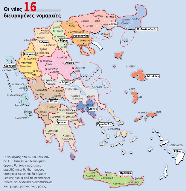 Το 1836, οι νομοί καταργήθηκαν και η επικράτεια χωρίστηκε σε 30 διοικήσεις και σε 19 υποδιοικήσεις. Επανήλθαν όμως το 1845 με τη διαφορά ότι οι επαρχίες αυξήθηκαν σε 49. Από τότε έγιναν πολλές αλλαγές και σήμερα οι νομοί φτάνουν τους 52 με μεγαλύτερο σε έκταση εκείνου της Αιτωλοακαρνανίας και με μικρότερο σε έκταση εκείνον της Λευκάδας.