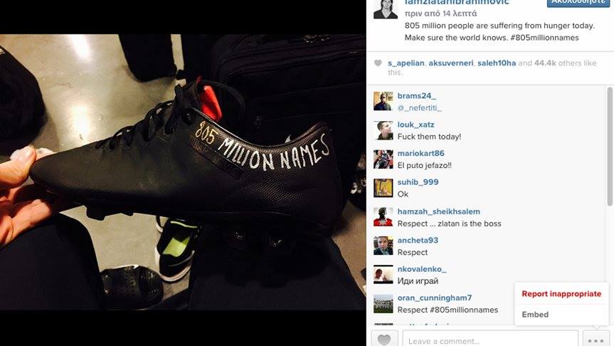 O Σουηδός άσος έστειλε και πάλι το μήνυμα του μέσο instagram αυτήν την φορά. Ζωγράφισε πάνω στα παπούτσια που θα φορέσει απέναντι στην Τσέλσι το δικό του μήνυμα ενάντια στην πείνα, χαράζοντας πάνω τους ''805 εκατομμύρια ονόματα'', όσα και τα θύματα αυτής της μάστιγας αυτή την στιγμή στον κόσμο.