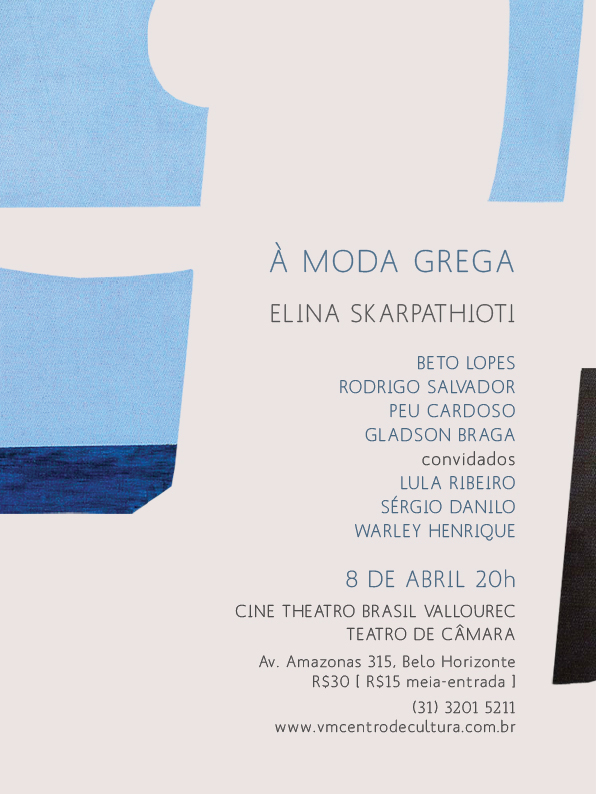 Μία αρκετά ασυνήθιστη συναυλία θα πραγματοποιηθεί την Τρίτη 8 Απριλίου στο Belo Horizonte στη Βραζιλία: Η Ελληνίδα τραγουδίστρια, πιανίστρια και πολιτιστική δημοσιογράφος, Ελίνα Σκαρπαθιώτη, θα συναντηθεί με μερικούς από τους πιο εξαίρετους μουσικούς της BH στο Cine Theatro Brasil (Theatro de Camara). Η παράσταση θα περιλαμβάνει μερικά από τα πιο γνωστά ελληνικά τραγούδια του λαϊκού αλλά και μερικά των πιο γνωστών συνθετών όπως ο Μάνος Χατζιδάκις και ο Μίκης Θεοδωράκης.