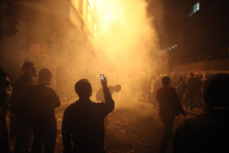 2011: Ενας φοιτητής καταγράφει σε βίντεο την ατμόσφαιρα, μετά από τη ρίψη δακρυγόνων από αστυνομία στην πλατεία Ταχρίρ, στο Κάιρο.