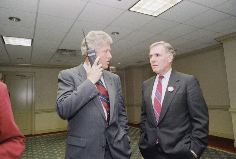 1992: Ο τότε υποψήφιος των Δημοκρατικών στις προεδρικές εκλογές, Μπιλ Κλίντον μιλά στο κινητό ενώ συναντά το δήμαρχο της Βοστώνης, Ρέι Φλιν, στη Νέα Υόρκη.
