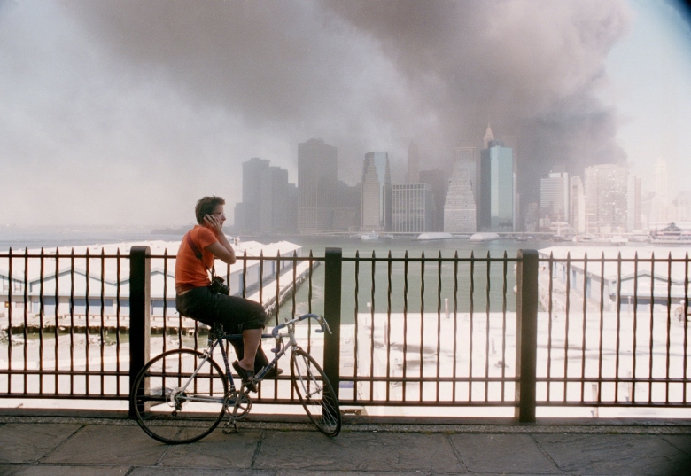2001: Μία γυναίκα παρακολουθεί τον μαύρο καπνό να υψώνεται από τους Δίδυμους Πύργους, στις 11 Σεπτεμβρίου.