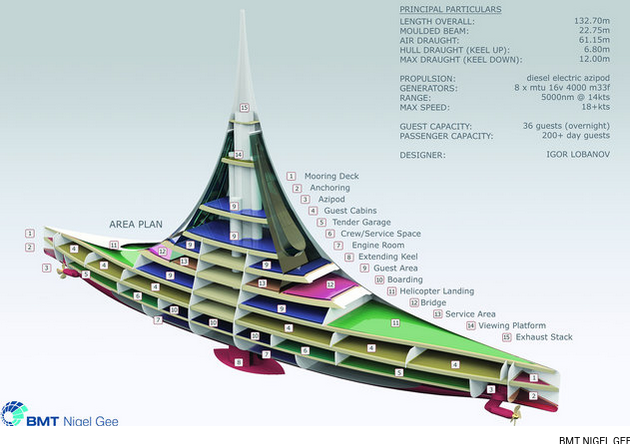 Το γιοτ έχει πλάτος 131 μέτρα, ύψος 60 μέτρα, οι χώροι του θα φτάνουν μέχρι και τα 11.483 τετραγωνικά μέτρα. Θα μπορούν να κοιμηθούν 36 άτομα αλλά χωράει και άλλους 200 επισκέπτες. Ακόμη, θα έχει ένα κατάστρωμα υποβρύχιο και οκτώ καταστρώματα παρατήρησης.