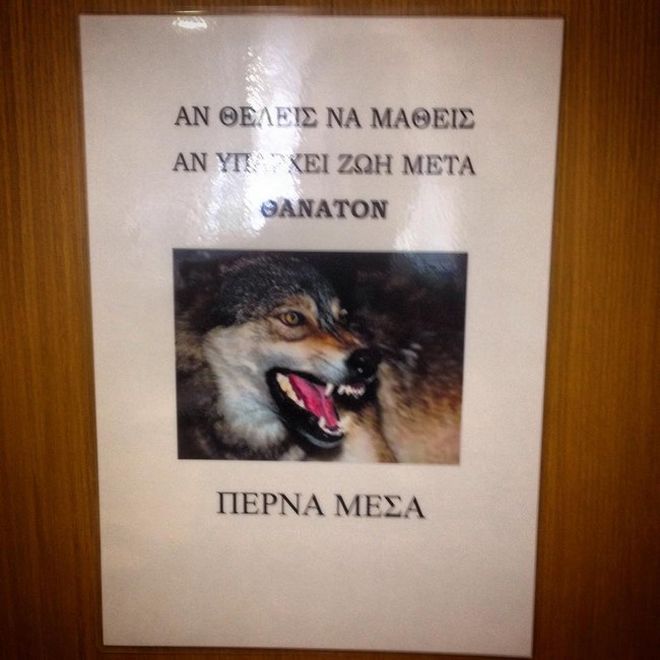 Συνήθως η πόρτα γράφει "Γραφείο Δημάρχου". Αλλά όχι στο Δήμο της Θεσσαλονίκης. Δημοτικός σύμβουλος ανάρτησε στο διαδίκτυο την ταμπέλα που έχει στο γραφείο του ο κ. Μπουτάρης με την πρόθεση να ... αποθαρρύνει μάλλον τους επίδοξους επισκέπτες του. Ένα μαντρόσκυλο έτοιμο να επιτεθεί με την ευρηματική ρήση: "Αν θέλεις να μάθεις αν υπάρχει ζωή μετά θάνατον, πέρνα μέσα".
