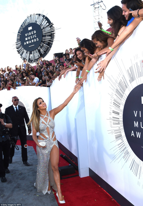 Η Λατίνα σταρ εμφανίστηκε στα βραβεία του MTV φορώντας ένα μακρύ φόρεμα που αγκάλιαζε το κορμί της και άφηνε ακάλυπτη τη μέση της αλλά και το αριστερό της πόδι ως ψηλά το μηρό.
