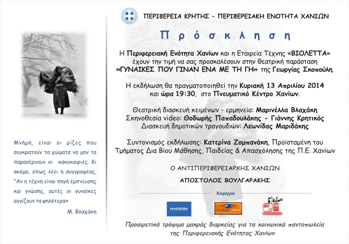 Η Περιφερειακή Ενότητα Χανίων συνδιοργανώνει με την Εταιρεία Τέχνης «ΒΙΟΛΕΤΤΑ» την θεατρική παράσταση με τίτλο: «ΓΥΝΑΙΚΕΣ ΠΟΥ ΓΙΝΑΝ ΕΝΑ ΜΕ ΤΗ ΓΗ» . Η εκδήλωση θα πραγματοποιηθεί την Κυριακή 13 Απριλίου 2014 και ώρα 19:30 στο Πνευματικό Κέντρο Χανίων.