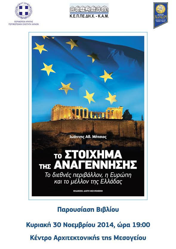 Η Περιφερειακή Ενότητα Χανίων, ο Δήμος Χανιών και η ΚΕΠΠΕΔΗΧ - ΚΑΜ προσκαλούν τον κόσμο στη παρουσίαση του βιβλίου, του Πολιτικού Επιστήμονα και Διεθνολόγου κ. Γιάννη Μήτσιου με τίτλο: "Το στοίχημα της Αναγέννησης. Το Διεθνές περιβάλλον, η Ευρώπη και το μέλλον της Ελλάδας".