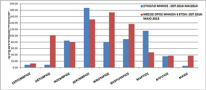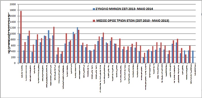 Ειδικότερα, η αξιολόγηση των δεδομένων, από 37 σταθμούς, κατέδειξε ότι κατά το τρέχον έτος η βροχόπτωση στην Κρήτη εμφανίζει στις περισσότερες περιοχές σημαντική μείωση η οποία προκύπτει από τη σύγκριση της συνολικής βροχόπτωσης των μηνών Σεπτεμβρίου 2013 μέχρι Μάιου 2014 σε σχέση με την αντίστοιχη μέση βροχόπτωση των τριών προηγούμενων ετών 2010-2013