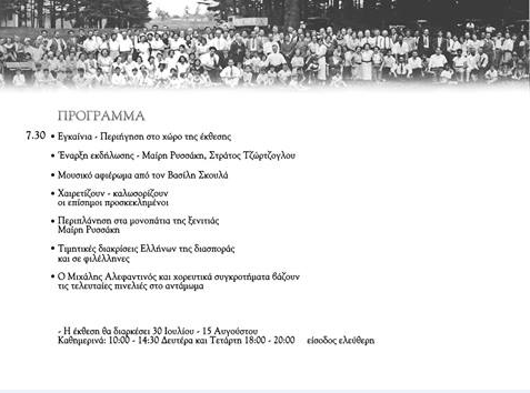 Οι εκδηλώσεις θα ξεκινήσουν στις 30 Ιουλίου και θα ολοκληρωθούν στις 15 Αυγούστου 2014. Θα πραγματοποιηθεί έκθεση παλιού φωτογραφικού και ιστορικού υλικού που αφορά τον Έλληνα της διασποράς από πολλές χώρες, όπως την Αμερική, τον Καναδά, την Αυστραλία, τη Νέα Ζηλανδία κ.λ.π.