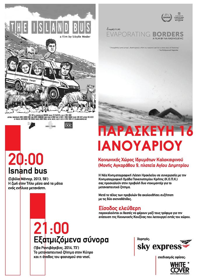 Η Νέα Κινηματογραφική Λέσχη Ηρακλείου παρουσιάζει για πρώτη φορά στο Ηράκλειο τα ντοκιμαντέρ The Island Bus και Εξατμιζόμενα Σύνορα αύριο, Παρασκευή 16 Ιανουαρίου στις 8μμ στον Κοινωνικό Χώρο των Ιδρυμάτων Καλοκαιρινού.