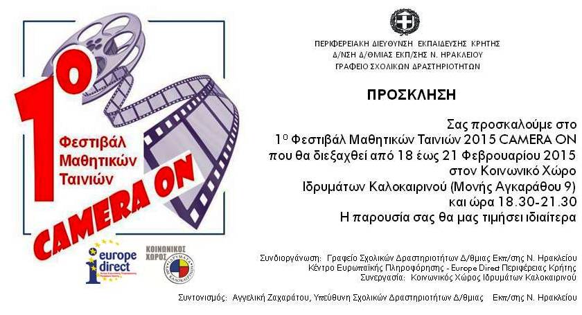 Το Γραφείο Σχολικών Δραστηριοτήτων Δευτεροβάθμιας Εκπαίδευσης Ν. Ηρακλείου, το Κέντρο Ευρωπαϊκής Πληροφόρησης - Europe Direct Περιφέρειας Κρήτης, σε συνεργασία με τον Κοινωνικό Χώρο των Ιδρυμάτων Α. & Μ. Καλοκαιρινού παρουσιάζουν το 1ο Φεστιβάλ Μαθητικών Ταινιών 2015 «CAMERA ON» που θα πραγματοποιηθεί στον Κοινωνικό Χώρο (Μονής Αγκαράθου 9) από Τετάρτη 18 Φεβρουαρίου ως Σάββατο 21 Φεβρουαρίου και ώρα 18:30-21:30. Στο Φεστιβάλ θα προβληθούν εκατό μαθητικές ταινίες, μικρού και μεγάλου μήκους, ντοκιμαντέρ, σποτ με κοινωνικά μηνύματα κ.ά. που υλοποιήθηκαν στο πλαίσιο σχολικών δράσεων. Τον συντονισμό του Φεστιβάλ έχει η Αγγελική Ζαχαράτου, Υπεύθυνη Σχολικών Δραστηριοτήτων Δευτεροβάθμιας Εκπαίδευσης Ν. Ηρακλείου.