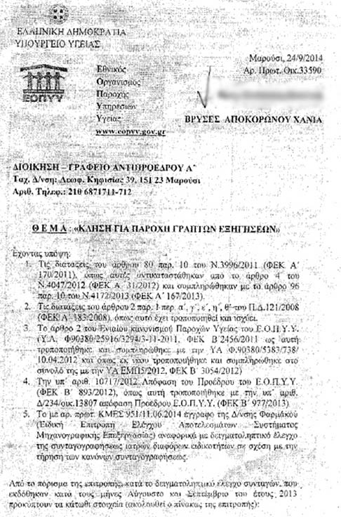 Συγκεκριμένα το θέμα έκανε γνωστό με δηλώσεις του στο Ράδιο Κρήτη και στο ekriti.gr ο πρόεδρος των νοσοκομειακών γιατρών ΕΣΥ Ν.Ηρακλείου Γιώργος Κωστάκης ο οποίος ανέφερε ότι τις τελευταίες ημέρες συνάδελφοί του έλαβαν από τον ΕΟΠΥΥ και συγκεκριμένα από την πρώτη διοίκηση του Αντιπροέδρου έναν σχετικό φάκελο με θέμα «Κλήση για παροχή γραπτών εξηγήσεων» στον οποίο τους ζητείται να τεκμηριώσουν ορισμένα φάρμακα τα οποία έγραψαν στους ασφαλισμένους σε διαφορετική περίπτωση θα τα χρεώσουν στο ΑΦΜ τους στην εφορία!!