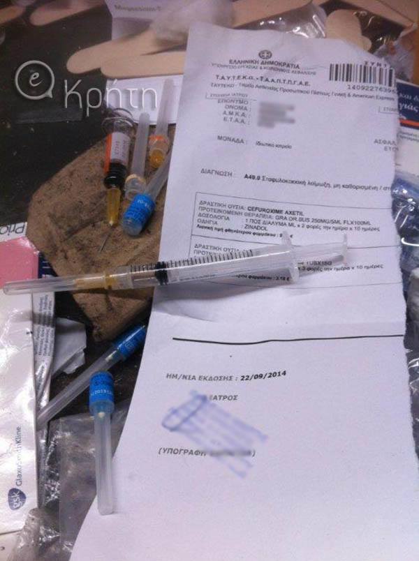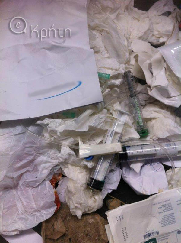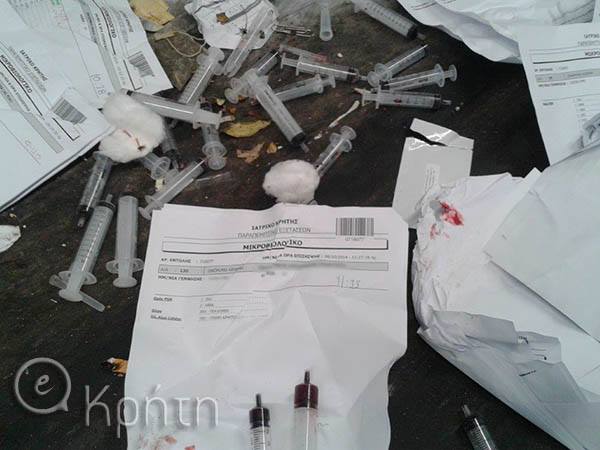 Το eΚρήτη δημοσιεύει σήμερα ανατριχιαστικές φωτογραφίες, που προσκόμισαν ακροατές του Ράδιο Κρήτη στον δημοσιογράφο Νίκο Ψιλάκη και απεικονίζουν εξετάσεις ασθενών (τα ονόματα έχουν αλλοιωθεί) σύριγγες με αίματα, μικροβιολογικά δείγματα, αποδείξεις γιατρών, απορρίμματα κλινικών, σε ένα επαχθές και αηδιαστικό μείγμα που καταλήγει στα χέρια των υπαλλήλων της Υπηρεσίας καθαριότητας.