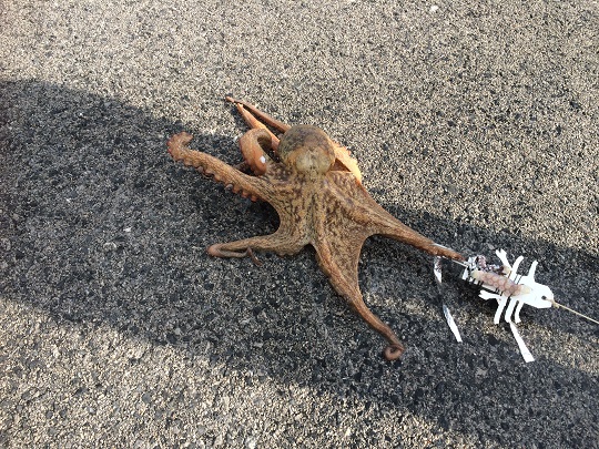 Ένα αρκετά μεγάλο χταπόδι ήταν τελικά αυτό που ξεγελάστηκε από το δόλωμα των δύο μικρών κομματιών πλοκαμιού που είχε τοποθετήσει στο αγκίστρι του ο ψαράς.