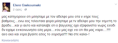 Οργισμένη με όσους υποστηρίζουν ότι ο Βαγγέλης εξαφανίστηκε αφού πρώτα μάλωσε με την οικογένεια του, εμφανίστηκε στην προσωπική της σελίδα στο facebook η αδελφή του Ελένη.