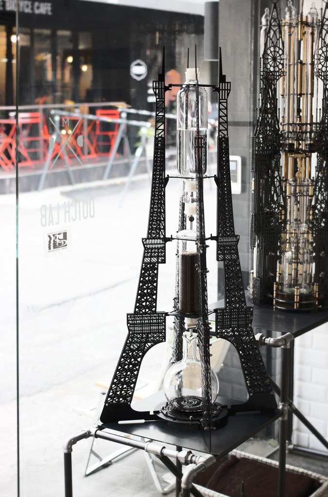 Μία καφετιέρα διαφορετική από τις άλλες δημιούργησε εταιρεία που εδρεύει στη Σεούλ μιμούμενη τη δομή και τις αρχιτεκτονικές λεπτομέρειες του Πύργου του Άιφελ. Τόσο η αισθητική όσο και η λειτουργικότητα αποτελεί ... μικρογραφία του Πύργου του Άιφελ. Μια γυάλινη κανάτα προσαρμόζεται στο εσωτερικό του, ενώ ο μηχανισμός κρύβεται επιμελώς μέσα στα μεταλλικά στοιχεία του Πύργου.
